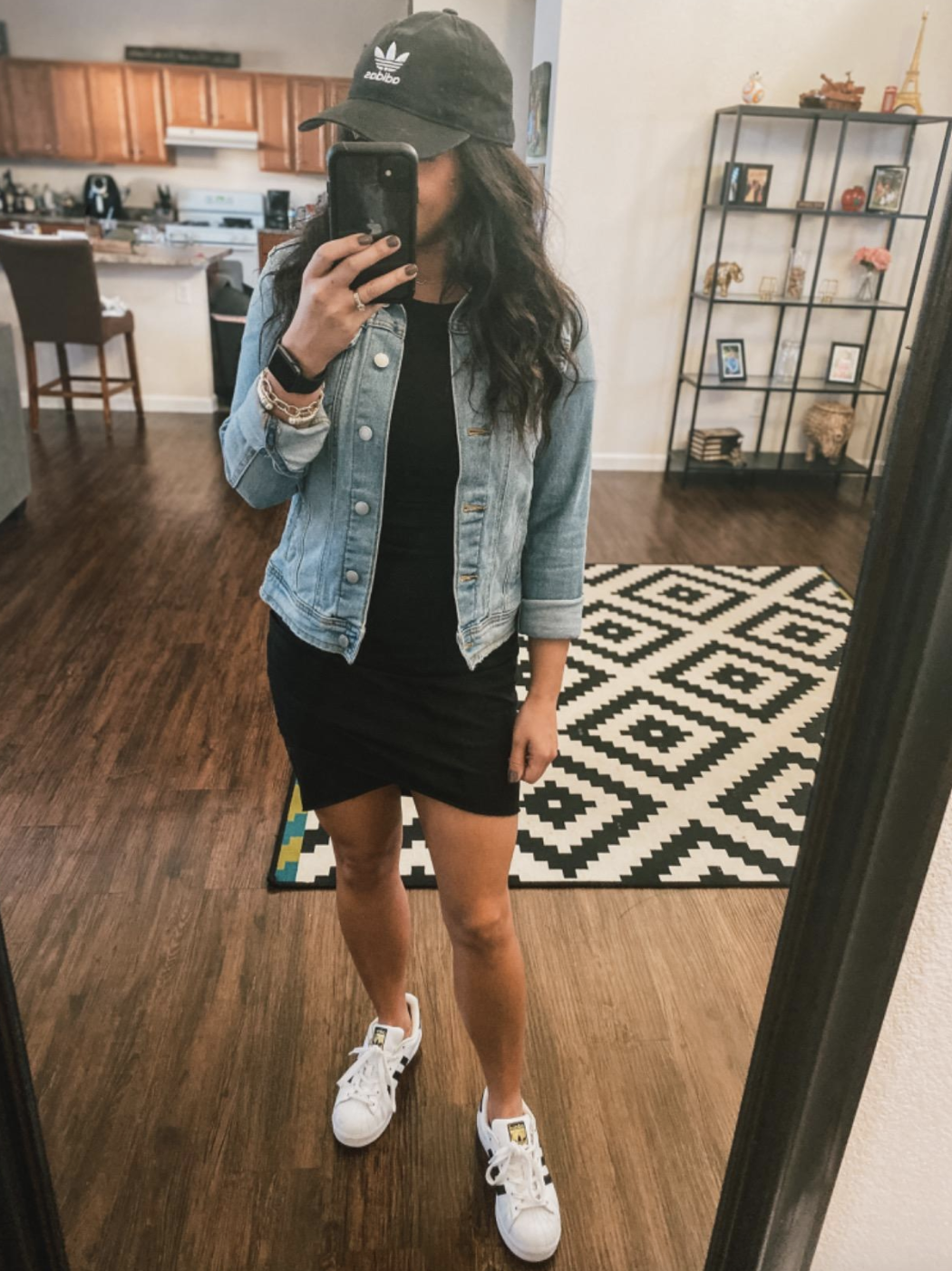 Little Black Dress Jean Jacket Outfit Denim Jacket Outfit Golden Goose Sneaker Outfit Casual Dress Outfits Fashion Jackson Fashion